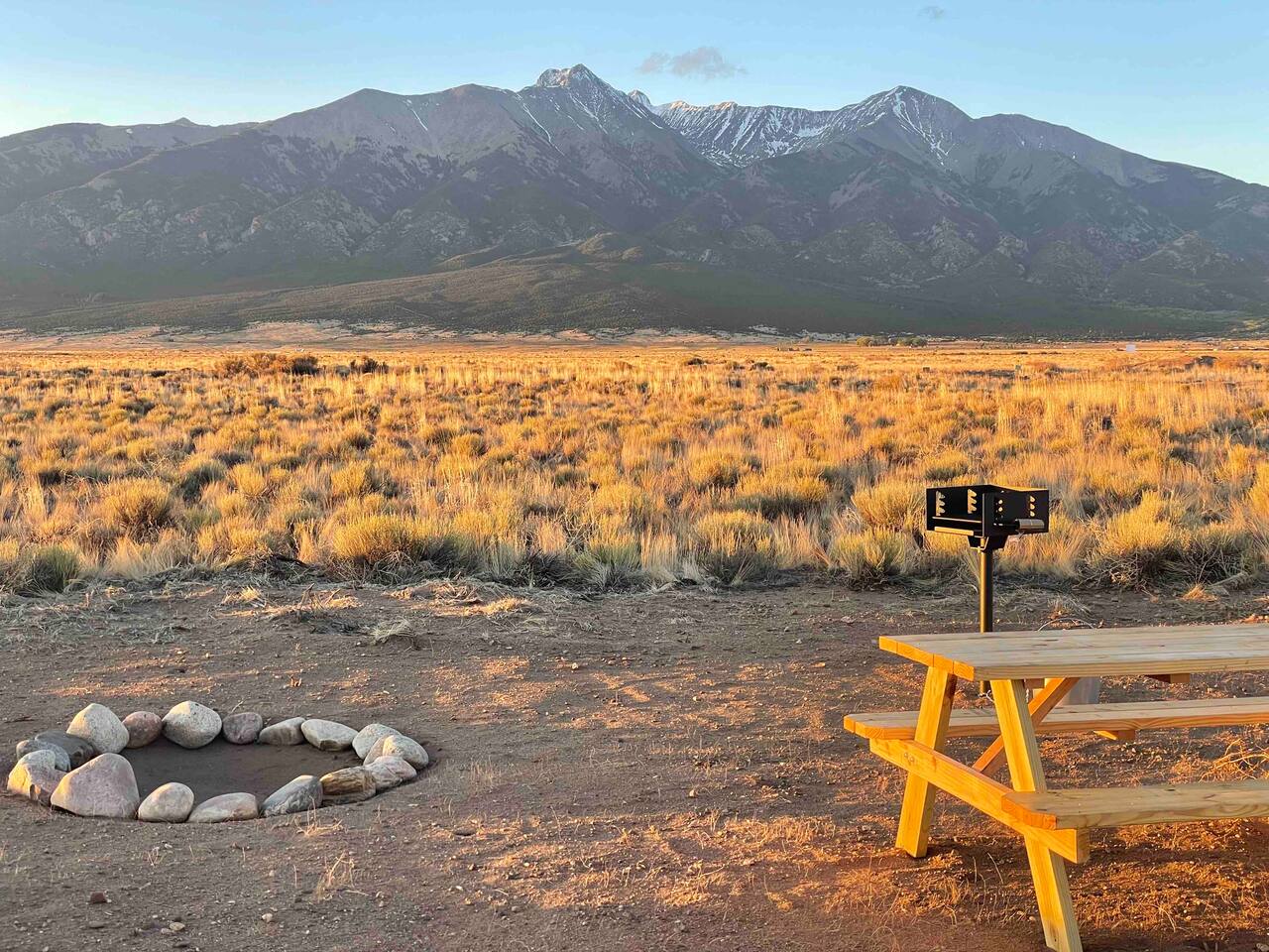 This beautiful camp spot has views of Mount Blanca. Simple living off the grid and enjoying nature. Bench, fire pit, and grill for convenience. Port a potty as well. This takes you back to a simpler time.